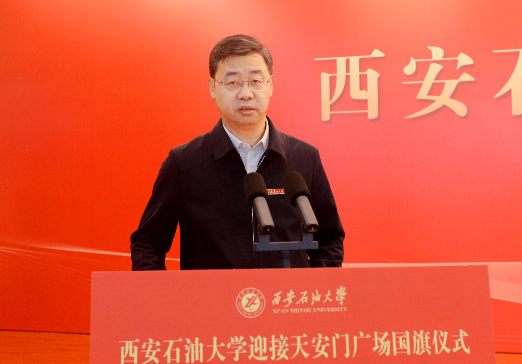 校長(zhǎng)王進(jìn)富發(fā)表致辭,他總結(jié)回顧了學(xué)校74年來(lái)與黨和國(guó)家同向同行、為祖國(guó)能源事業(yè)不懈奮斗的辦學(xué)歷程,強(qiáng)調(diào)學(xué)校始終“以‘石’為基、以‘油’鑄魂”, 在服務(wù)國(guó)家能源戰(zhàn)略中彰顯使命擔(dān)當(dāng),培養(yǎng)了一批又一批能源領(lǐng)域的棟梁之才。他向全體師生提出三點(diǎn)希望:一是希望全體師生高擎信仰之炬,把弘揚(yáng)愛(ài)國(guó)主義精神作為永恒主題。要持續(xù)發(fā)揮好這面國(guó)旗的愛(ài)國(guó)主義教育功能,開(kāi)展內(nèi)容豐富、形式多樣的愛(ài)國(guó)主義教育活動(dòng),營(yíng)造愛(ài)黨愛(ài)國(guó)、愛(ài)校榮校的濃厚氛圍;二是希望全體師生堅(jiān)定強(qiáng)國(guó)信念,把踐行奮斗實(shí)干擔(dān)當(dāng)作為精神底色。要堅(jiān)持石油精神辦學(xué)、鐵人精神育人、延安精神鑄魂,秉承“愛(ài)國(guó)奉獻(xiàn)、艱苦奮斗、科學(xué)求實(shí)、開(kāi)拓進(jìn)取”的辦學(xué)精神,全面落實(shí)立德樹(shù)人根本任務(wù),不斷提升服務(wù)國(guó)家能源戰(zhàn)略與區(qū)域發(fā)展的能力,在教育強(qiáng)國(guó)建設(shè)中展現(xiàn)更大作為;三是希望全體師生挺膺擔(dān)當(dāng)之志,把矢志能源報(bào)國(guó)使命作為畢生追求。廣大教師要弘揚(yáng)教育家精神,以赤誠(chéng)之心、奉獻(xiàn)之心、仁愛(ài)之心教書(shū)育人,做學(xué)生成長(zhǎng)的引路人,廣大學(xué)子要秉承“好學(xué)力行、自強(qiáng)不息”的校訓(xùn),傳承鐵人精神,將使命扛在肩頭,為國(guó)家能源事業(yè)貢獻(xiàn)青春力量。