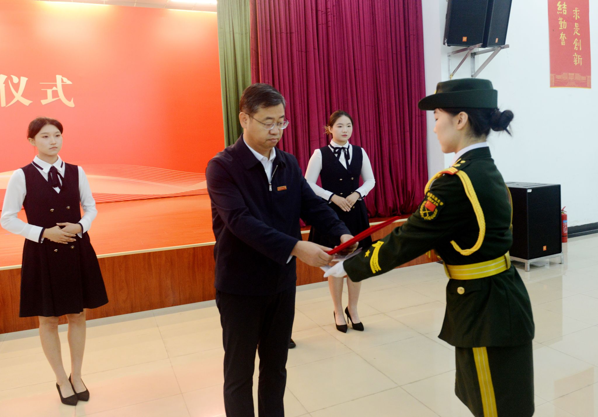 上午8時(shí),儀式在莊嚴(yán)的氛圍中正式開(kāi)始。校長(zhǎng)王進(jìn)富將獲贈(zèng)的國(guó)旗及證書(shū)鄭重交予學(xué)校國(guó)旗護(hù)衛(wèi)隊(duì),國(guó)旗護(hù)衛(wèi)隊(duì)隊(duì)員神情肅穆,步伐鏗鏘,莊嚴(yán)地護(hù)送國(guó)旗入場(chǎng)。這面國(guó)旗旗長(zhǎng)5米、寬3.3米,為超大國(guó)旗,整幅旗面無(wú)拼接,五顆星由織造人員手工縫制,工藝特殊,承載著億萬(wàn)中華兒女的深厚愛(ài)國(guó)情懷,也凝聚著我校建校70周年的特別紀(jì)念。