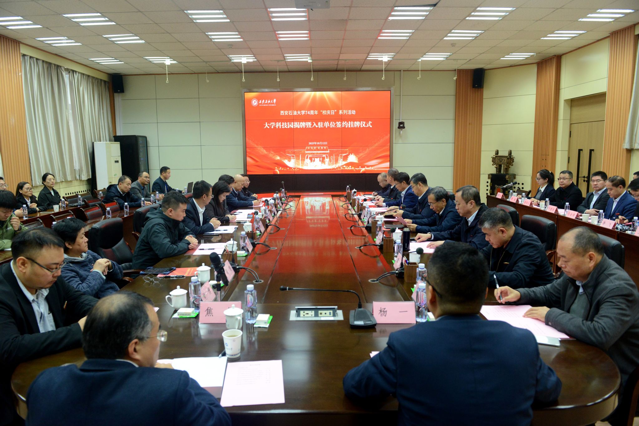 10月12日下午,在建校74周年之際,西安石油大學(xué)科技園揭牌暨入駐單位簽約掛牌儀式在我校雁塔校區(qū)舉行。校長王進富,副校長蘇文甫、張榮軍出席儀式,行業(yè)相關(guān)企業(yè)代表與學(xué)校相關(guān)職能部門、學(xué)院負責人及師生代表參加活動。儀式由校黨委副書記張木主持。