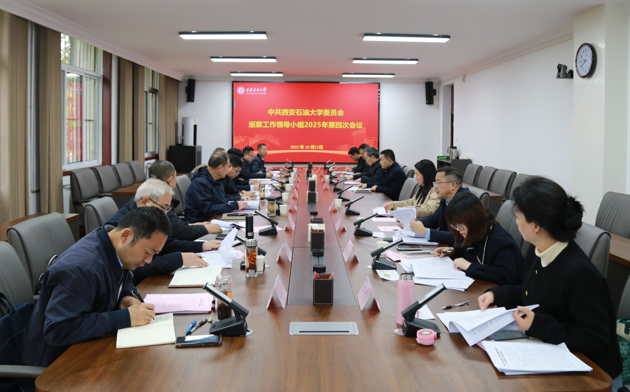 10月21日上午,學(xué)校黨委巡察工作領(lǐng)導(dǎo)小組2025年第四次會(huì)議在鄠邑校區(qū)第三會(huì)議室召開(kāi),聽(tīng)取第三屆黨委第一輪巡察整改工作總體情況匯報(bào)和四個(gè)被巡察院(系)黨組織整改落實(shí)情況匯報(bào)。校黨委副書(shū)記、校長(zhǎng)王進(jìn)富出席會(huì)議并講話。校黨委副書(shū)記、紀(jì)委書(shū)記、監(jiān)察專(zhuān)員,校黨委巡察工作領(lǐng)導(dǎo)小組副組長(zhǎng)王輝強(qiáng)主持會(huì)議。黨委辦公室、紀(jì)檢監(jiān)察機(jī)構(gòu)、黨委巡察工作辦公室、黨委組織部、黨委宣傳部、黨委統(tǒng)戰(zhàn)部、黨委學(xué)生工作部、黨委教師工作部、黨委保衛(wèi)部、研究生工作部、審計(jì)處主要負(fù)責(zé)人和第一輪巡察四個(gè)被巡察院(系)黨委(黨總支)書(shū)記參加會(huì)議。