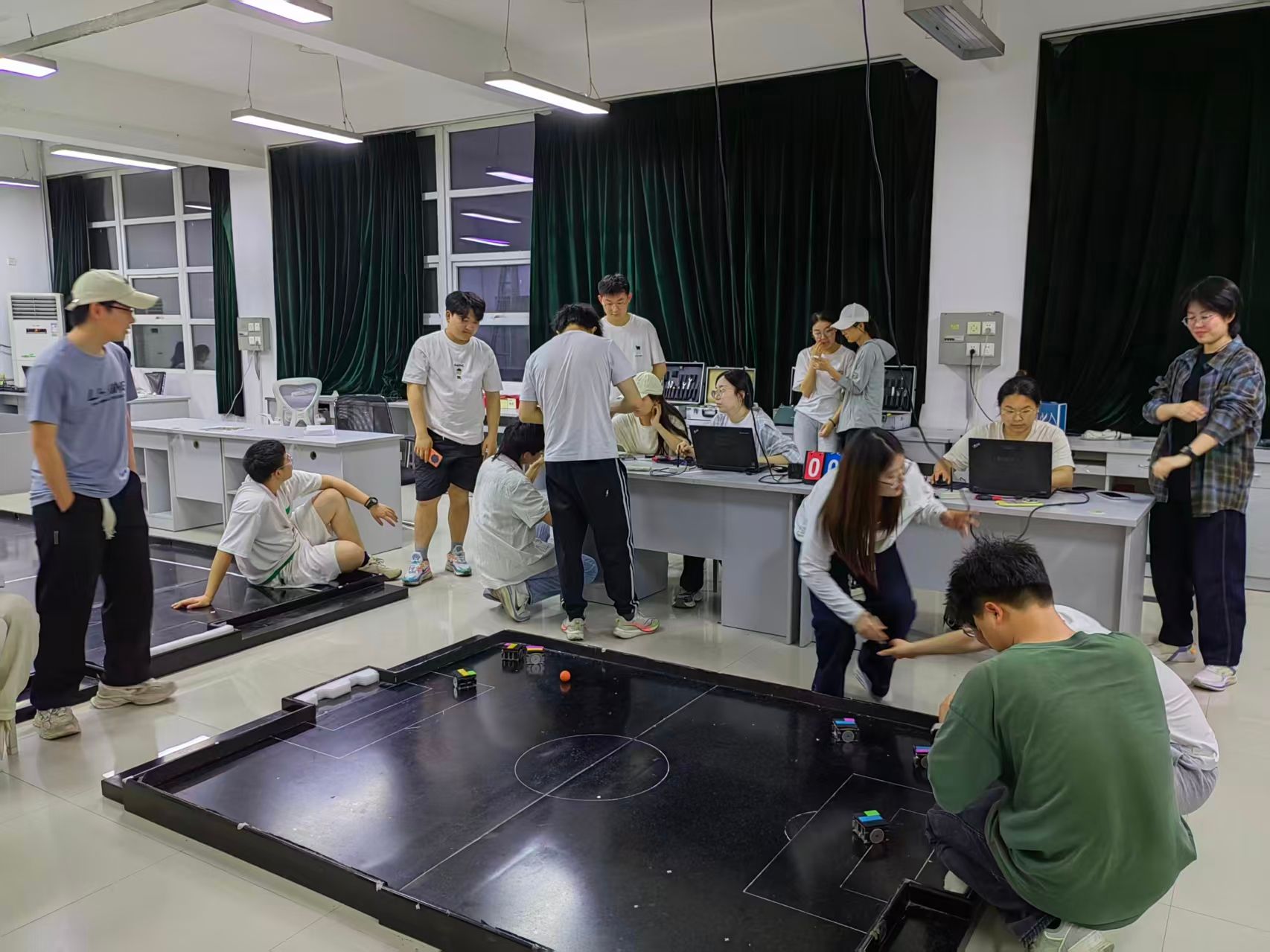 冠軍的獎(jiǎng)杯,由機(jī)器人團(tuán)隊(duì)師生無(wú)數(shù)個(gè)日夜的奮斗與汗水鑄就。為了備戰(zhàn)此次大賽,自今年年初便開(kāi)始了校賽培訓(xùn)、選拔和有計(jì)劃的集訓(xùn)。FIRA小型組的機(jī)器人需要極高的敏捷性和復(fù)雜的多機(jī)協(xié)作算法,代碼組隊(duì)員們?yōu)榱艘粋€(gè)戰(zhàn)術(shù)動(dòng)作,為了幾毫秒的速度提升,不斷進(jìn)行算法優(yōu)化和調(diào)試。在高強(qiáng)度的比賽和訓(xùn)練中,機(jī)器人面臨著持續(xù)的磨損與意外損傷,維護(hù)小組同學(xué)具備“外科醫(yī)生”般的精準(zhǔn)與耐心,守護(hù)著機(jī)器人的“身體健康”,每日賽前進(jìn)行全面的硬件檢測(cè),賽后則立即進(jìn)行保養(yǎng)檢修。從電機(jī)扭矩的細(xì)微校正、電池電量測(cè)定、小車(chē)胎皮檢測(cè)、傳感器靈敏度的反復(fù)標(biāo)定,從線(xiàn)路連接的緊固到齒輪傳動(dòng)的潤(rùn)滑,確保了每一臺(tái)機(jī)器人都能以最佳狀態(tài)投入每一場(chǎng)比賽。正是有了平時(shí)的訓(xùn)練有素,才有了賽場(chǎng)上的從容淡定。