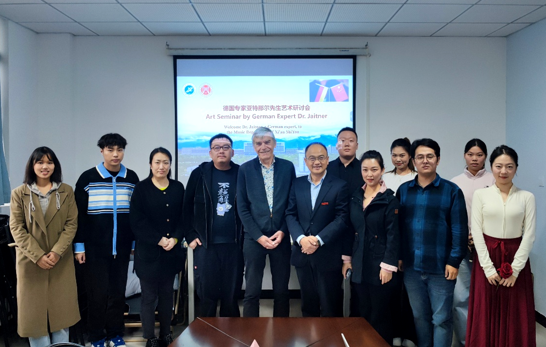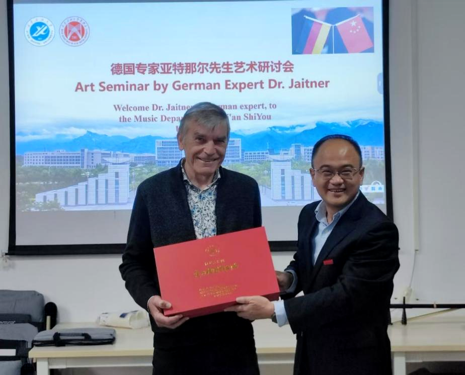 在專業(yè)交流環(huán)節(jié),雙方圍繞藝術(shù)創(chuàng)新與國際合作展開深入對話。師生與Jaitner先生就傳統(tǒng)音樂傳承、音樂劇創(chuàng)作、爵士樂發(fā)展等核心議題進行了專業(yè)探討。Jaitner先生結(jié)合國際視野提出建設(shè)性見解,為師生拓展了創(chuàng)作思路。會議還重點介紹了我校原創(chuàng)音樂劇《我為祖國找石油》,呈現(xiàn)音樂系在紅色題材藝術(shù)創(chuàng)作方面的探索成果。針對師生關(guān)注的德國留學(xué)與學(xué)術(shù)交流事宜,Jaitner先生詳細介紹了德國相關(guān)教育資源與文化環(huán)境,為有意赴德深造的師生提供了實用參考。