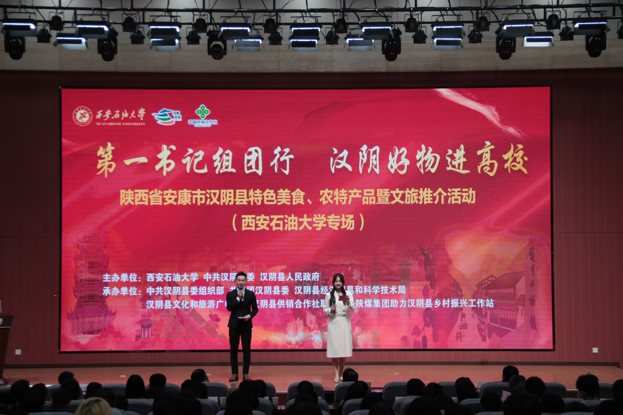 11月20日,“第一書記組團行?漢陰好物進高?!薄兾魇“部凳袧h陰縣特色美食、農(nóng)特產(chǎn)品暨文旅推介活動在我校鄠邑校區(qū)成功舉辦。漢陰縣委副書記王眾義,縣委常委、組織部長李萬華,縣政府黨組成員屈斐斐,縣委組織部、共青團漢陰縣委、經(jīng)濟貿(mào)易和科學(xué)技術(shù)局、文化和旅游廣電局、供銷合作社聯(lián)合社、陜煤集團助力漢陰縣鄉(xiāng)村振興工作站等單位負(fù)責(zé)人,省市縣部分派駐漢陰縣駐村第一書記和工作隊員代表,我校副校長種宇宏,黨委組織部、黨委學(xué)生工作部、校團委、教務(wù)處、科研處、校友工作與合作交流處、后勤處、西安石大資產(chǎn)經(jīng)營有限公司等單位負(fù)責(zé)人,各院(系)團委(團總支)書記,學(xué)生代表參與活動。