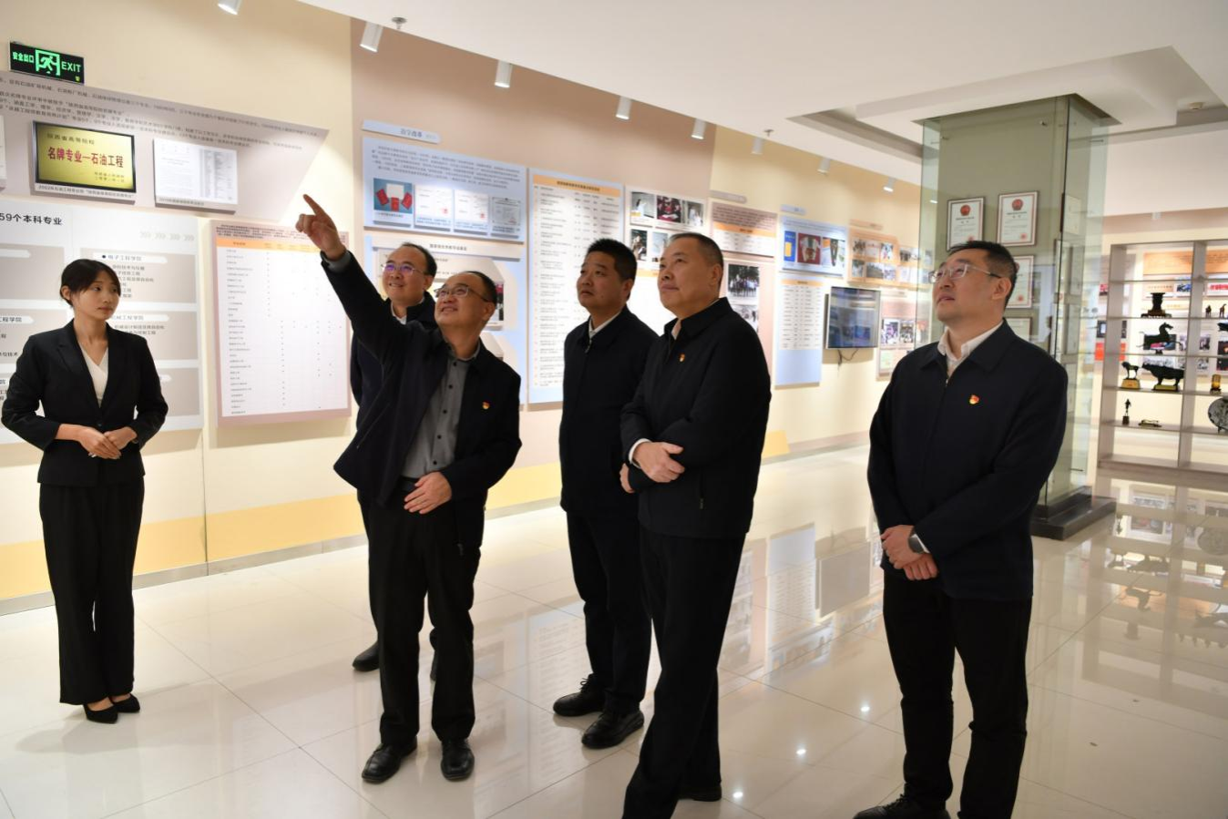 楊健、焦群朝一行與副校長(zhǎng)趙健、黨委辦公室(校長(zhǎng)辦公室)負(fù)責(zé)同志共同參觀我校鐵人王進(jìn)喜紀(jì)念館和校史館,開(kāi)展沉浸式學(xué)習(xí)交流。大家先后在鐵人王進(jìn)喜紀(jì)念館鉆井設(shè)備實(shí)物、會(huì)戰(zhàn)場(chǎng)景復(fù)原展區(qū)及校史館校友事跡、學(xué)校發(fā)展成果展前駐足停留,在珍貴史料與生動(dòng)場(chǎng)景中追尋精神根脈、感悟辦學(xué)初心。趙健結(jié)合展區(qū)實(shí)物與歷史背景,深入解讀了鐵人王進(jìn)喜“攻堅(jiān)克難、無(wú)私奉獻(xiàn)”的精神內(nèi)核,詳細(xì)講述了學(xué)校自創(chuàng)辦以來(lái),從服務(wù)行業(yè)發(fā)展到助力國(guó)家能源事業(yè)高質(zhì)量發(fā)展的奮進(jìn)歷程。在參觀過(guò)程中,雙方圍繞黨建賦能、文化傳承、人才培養(yǎng)等內(nèi)容深入交流,在精神共鳴中凝聚合作共識(shí)。