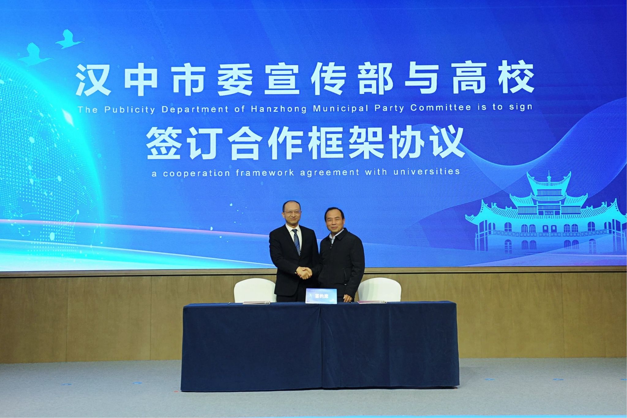 校黨委委員、宣傳部部長趙承勝代表學校與漢中市委宣傳部副部長、市融媒體中心主任孫國強現場簽約。