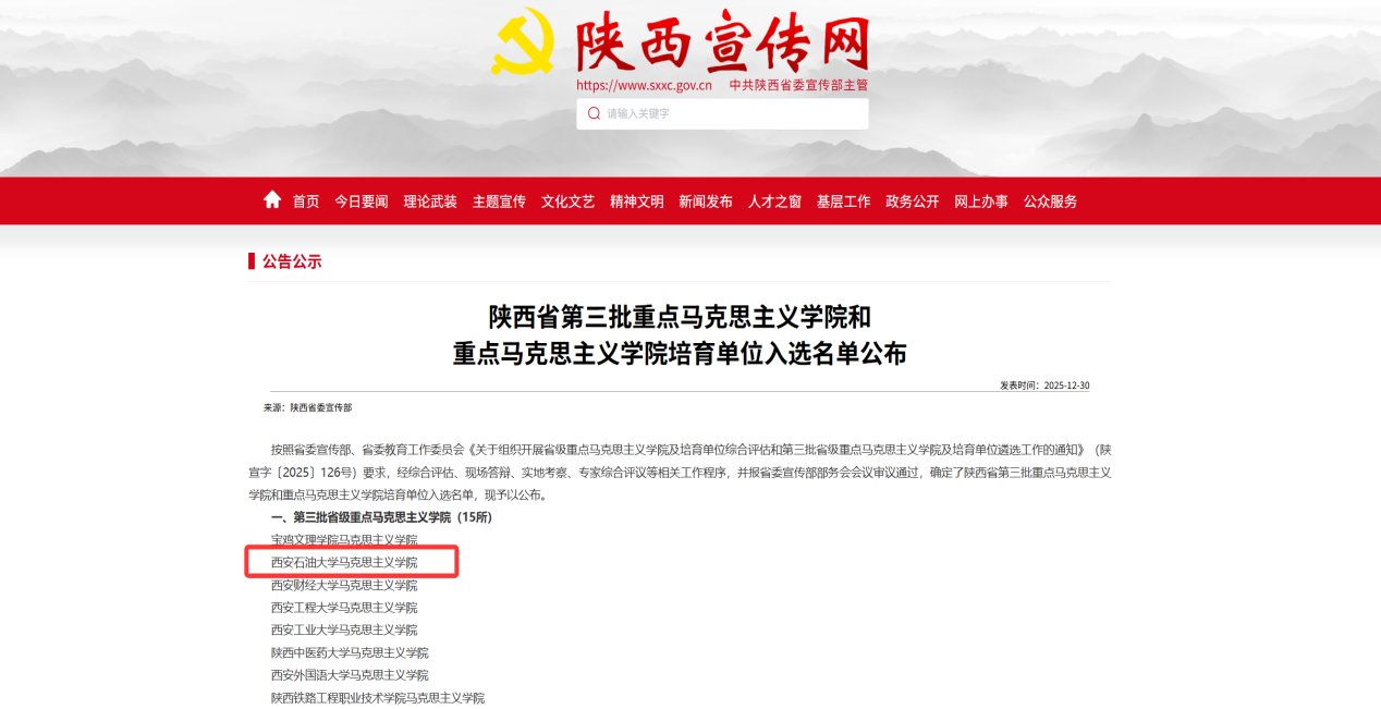 按照省委宣傳部、省委教育工作委員會(huì)《關(guān)于組織開(kāi)展省級(jí)重點(diǎn)馬克思主義學(xué)院及培育單位綜合評(píng)估和第三批省級(jí)重點(diǎn)馬克思主義學(xué)院及培育單位遴選工作的通知》(陜宣字〔2025〕126號(hào))要求,經(jīng)綜合評(píng)估、現(xiàn)場(chǎng)答辯、實(shí)地考察、專(zhuān)家綜合評(píng)議等相關(guān)工作程序,并報(bào)省委宣傳部部務(wù)會(huì)會(huì)議審議通過(guò),確定了陜西省第三批重點(diǎn)馬克思主義學(xué)院和重點(diǎn)馬克思主義學(xué)院培育單位入選名單,我校馬克思主義學(xué)院成功入選陜西省第三批重點(diǎn)馬克思主義學(xué)院。這標(biāo)志著我校馬克思主義學(xué)院建設(shè)邁入了新的階段,將在更高平臺(tái)、更高層次上開(kāi)啟新時(shí)代馬克思主義學(xué)院建設(shè)新征程。