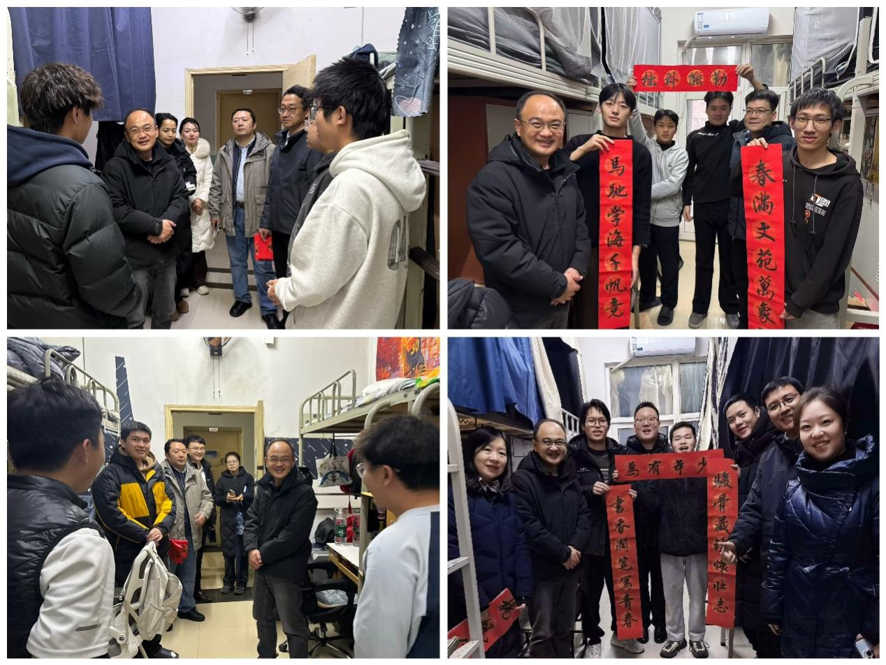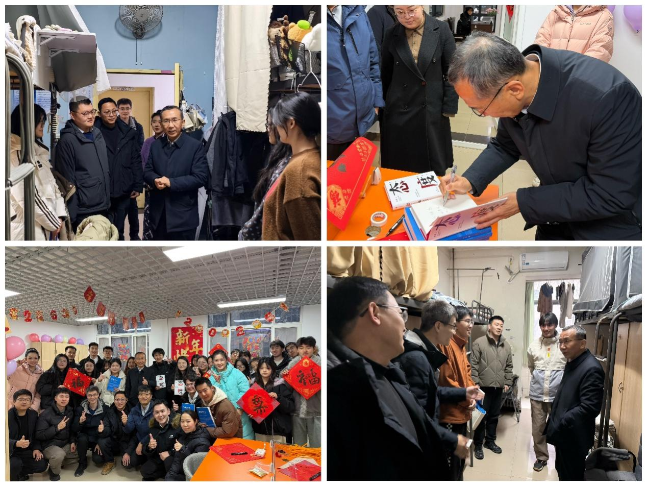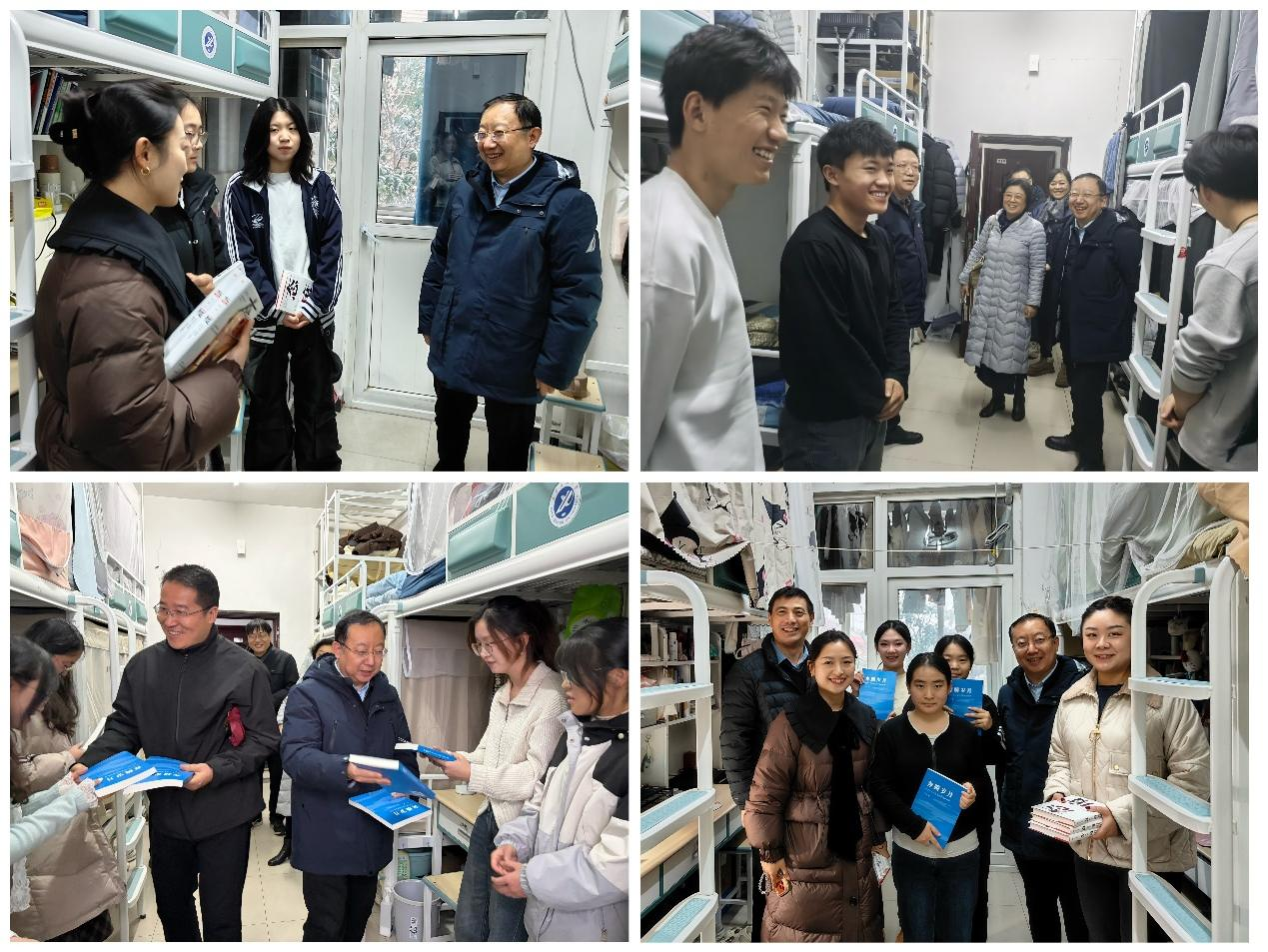 歲末迎新,暖意融融。在2026年元旦佳節(jié)來臨之際,學(xué)校領(lǐng)導(dǎo)深入各學(xué)院學(xué)生宿舍,走訪慰問留校學(xué)子,不僅通過贈(zèng)送精心挑選的書籍、親筆書寫的對(duì)聯(lián)等方式,送上真摯的新年祝福,還與同學(xué)們親切暢談學(xué)習(xí)生活與未來規(guī)劃,傳遞學(xué)校的深切關(guān)懷與殷切期許,讓初雪籠罩的校園滿溢溫情。學(xué)生工作部(處)、研究生工作部以及各院(系)相關(guān)負(fù)責(zé)同志陪同走訪。