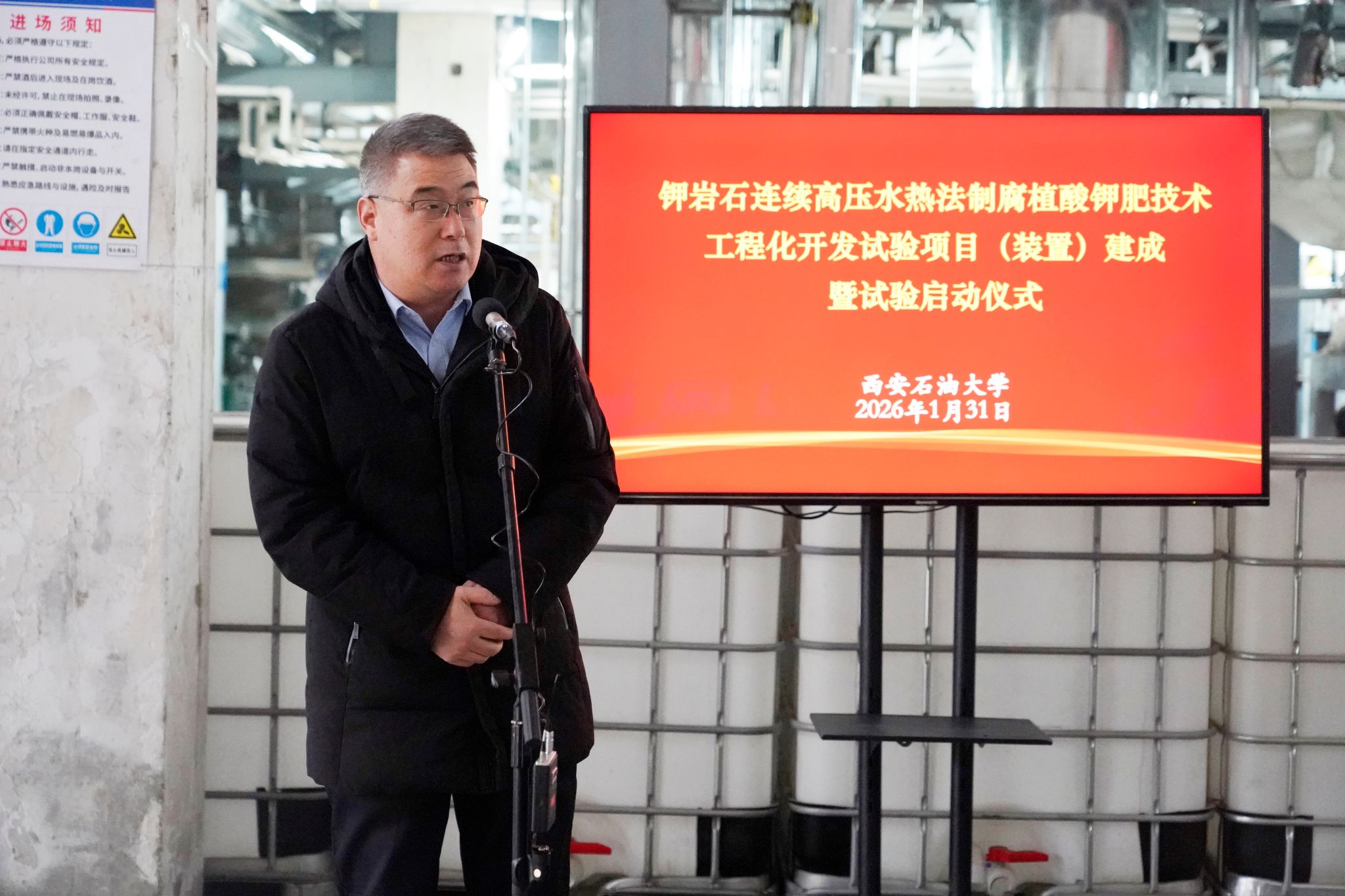 1月31日上午,西安石油大學(xué)“鉀巖石連續(xù)高壓水熱法制腐植酸鉀肥技術(shù)工程化開(kāi)發(fā)試驗(yàn)項(xiàng)目”建成暨試驗(yàn)啟動(dòng)儀式在鄠邑校區(qū)如期舉行。校黨委書(shū)記常江、校長(zhǎng)王進(jìn)富、副校長(zhǎng)張榮軍出席儀式,項(xiàng)目聯(lián)合科研團(tuán)隊(duì)負(fù)責(zé)人、承建單位代表以及學(xué)校相關(guān)職能處室負(fù)責(zé)人參加活動(dòng),共同見(jiàn)證項(xiàng)目落成投試的重要時(shí)刻。儀式由副校長(zhǎng)張君濤主持。