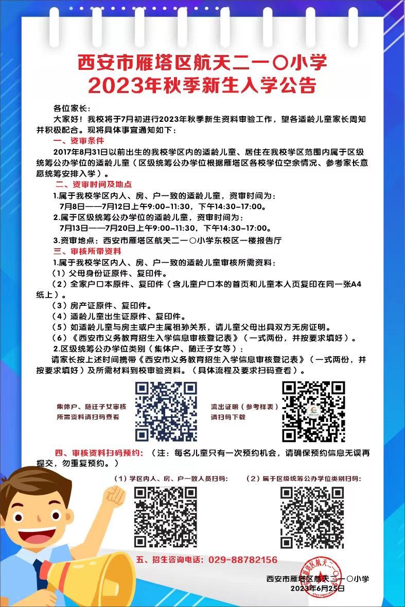 大家好!根據(jù)西安市雁塔區(qū)航天二一〇小學(xué)對轄區(qū)內(nèi)適齡兒童2023年秋季新生入學(xué)的通知安排,現(xiàn)將入學(xué)公告公布如下,請各位家長提前準(zhǔn)備資料,按時進(jìn)行資料審驗。