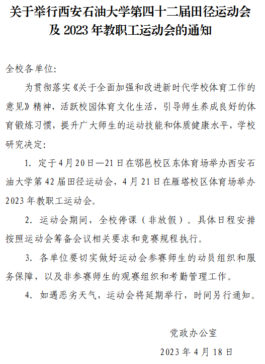 關(guān)于舉行西安石油大學(xué)第四十二屆田徑運(yùn)動(dòng)會(huì)及2023年教職工運(yùn)動(dòng)會(huì)的通知