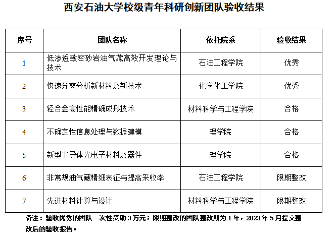 根據(jù)《西安石油大學科研創(chuàng)新團隊建設與管理辦法》與《西安石油大學青年科研創(chuàng)新團隊建設與管理辦法》(西石大科〔2021〕23號)文件精神及學校關于團隊考核的通知要求,經團隊自評申報、院系審核、科技處審查、學校組織專家評審等環(huán)節(jié),現(xiàn)將各類團隊期滿驗收和中期檢查結果公示如下。