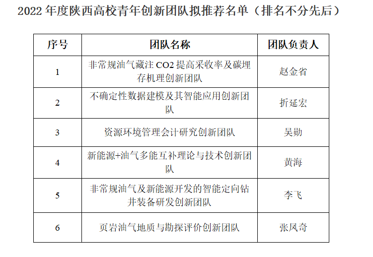 根據(jù)陜西省教育廳《關(guān)于2022年度陜西高校青年創(chuàng)新團(tuán)隊(duì)申報(bào)工作的通知》要求,經(jīng)院(系)推薦、科技處審查、學(xué)校組織專家組評(píng)審等程序,擬推薦趙金省、折延宏、吳勛、黃海、李飛、張鳳奇6人申報(bào)2022年度陜西高校青年創(chuàng)新團(tuán)隊(duì),現(xiàn)予以公示(名單附后)。