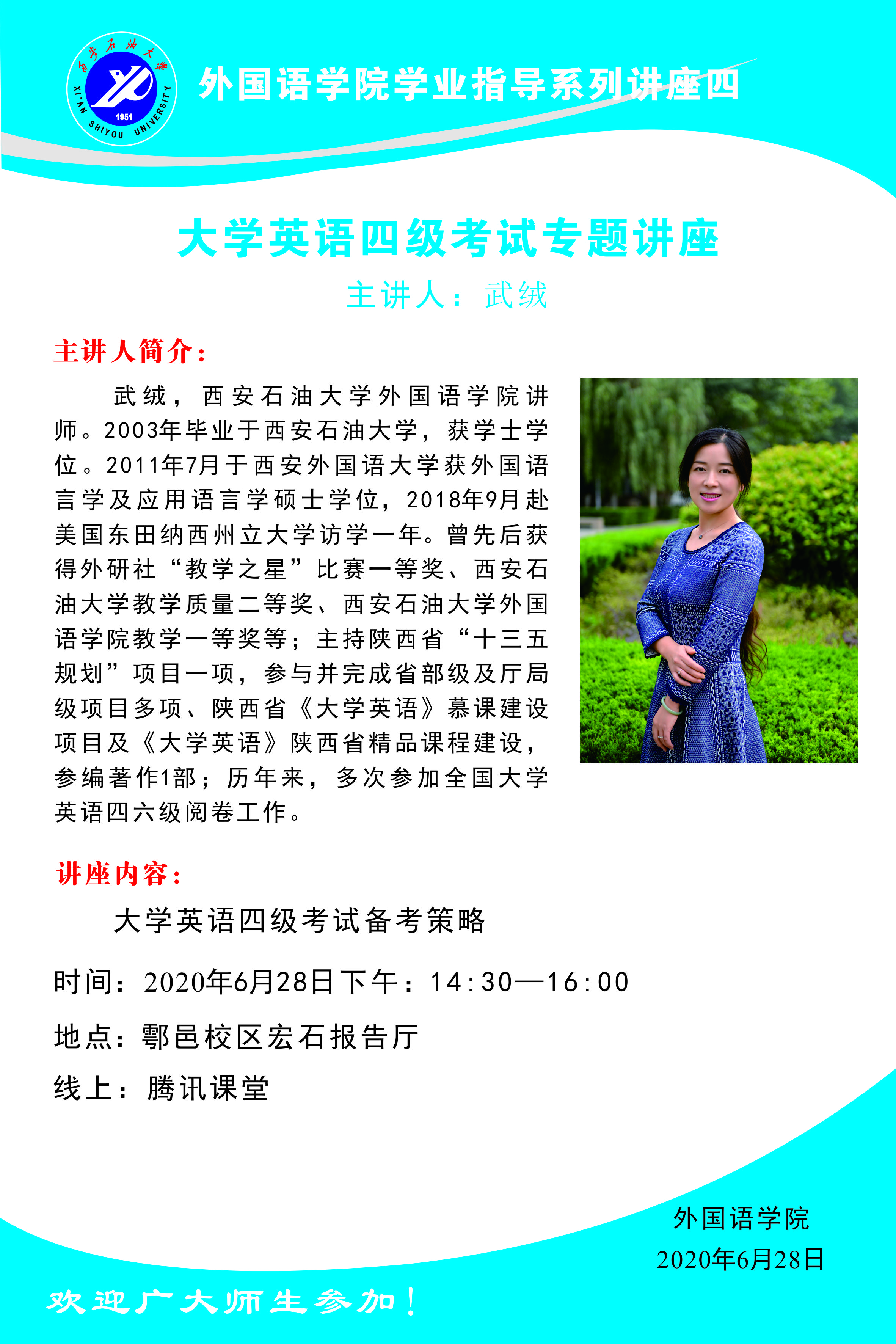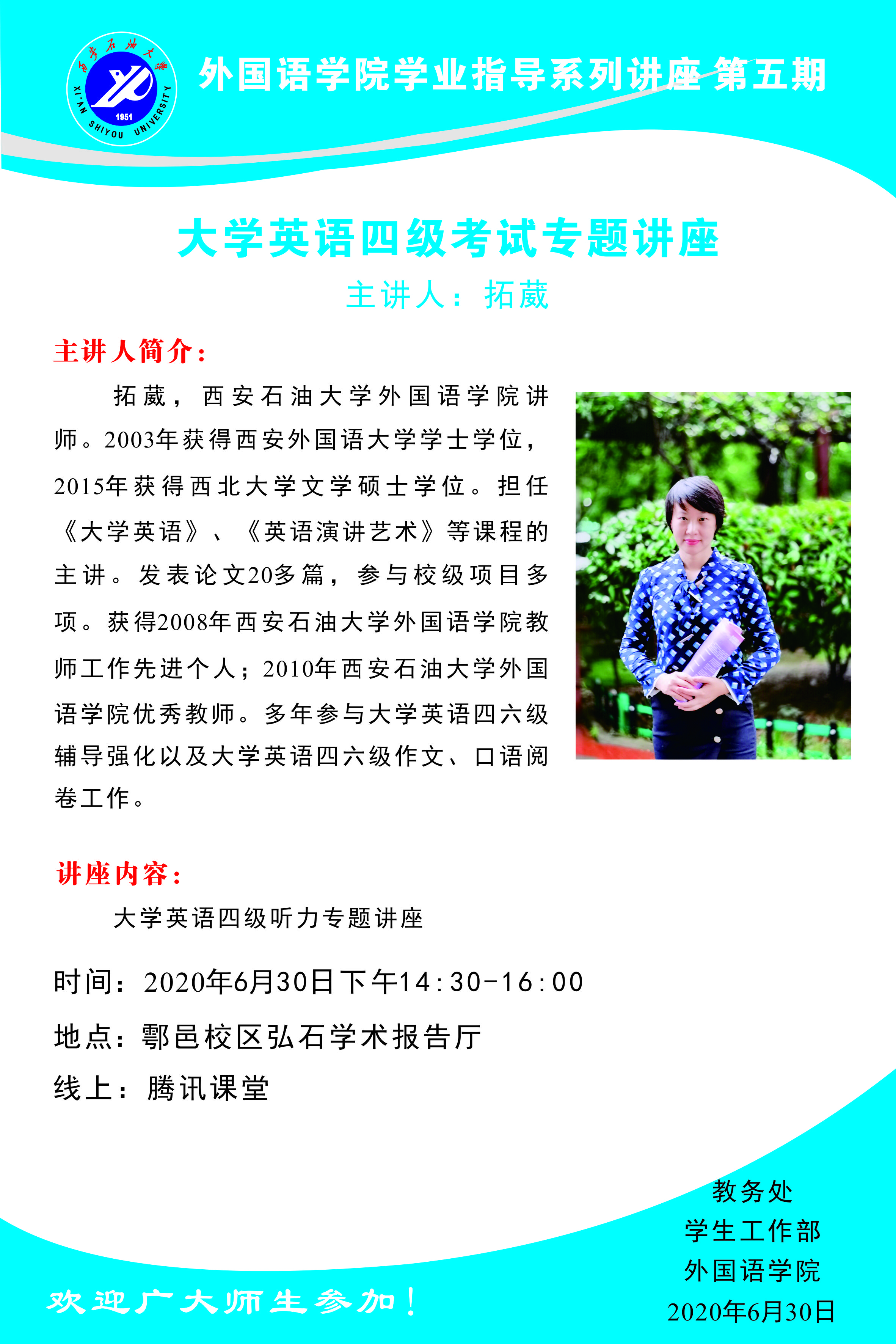 為提高我校學(xué)生英語(yǔ)語(yǔ)言應(yīng)用能力,提高大學(xué)英語(yǔ)四級(jí)通過率,外國(guó)語(yǔ)學(xué)院于2020年6月28日-7月9日和11月25日-12月9日分別舉辦大學(xué)英語(yǔ)四級(jí)講座共計(jì)十三場(chǎng),講座由外國(guó)語(yǔ)學(xué)院優(yōu)秀骨干教師擔(dān)任主講,分為聽力、閱讀、寫作、翻譯、應(yīng)考策略、真題解析等板塊。講座內(nèi)容包括大學(xué)英語(yǔ)四級(jí)考試的變化趨勢(shì)、大學(xué)英語(yǔ)四級(jí)考試題型、出題規(guī)律及大學(xué)英語(yǔ)四級(jí)考試應(yīng)試策略及注意事項(xiàng)。