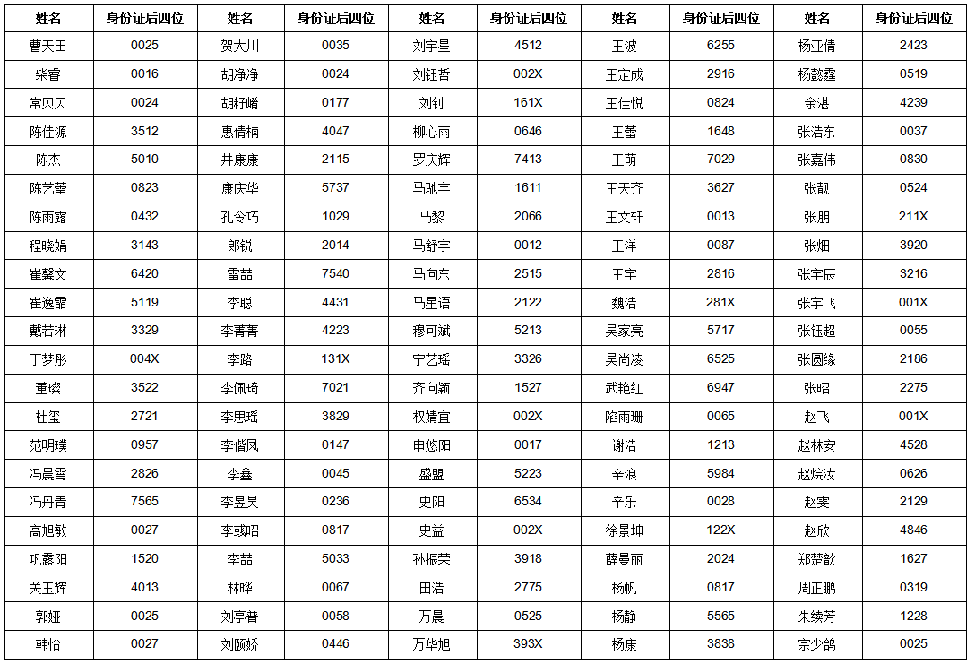 經(jīng)學校人事代理人員招聘統(tǒng)一筆試,以下人員進入專業(yè)技能測試考核環(huán)節(jié),現(xiàn)將人員名單及身份證號后四位公示如下(按姓氏拼音排序):