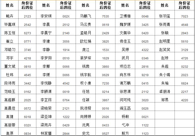 經(jīng)學(xué)校人事代理人員招聘統(tǒng)一筆試,以下同學(xué)進(jìn)入專業(yè)技能測(cè)試考核環(huán)節(jié),現(xiàn)將人員名單及身份證號(hào)后四位公示如下(按姓氏拼音排序):