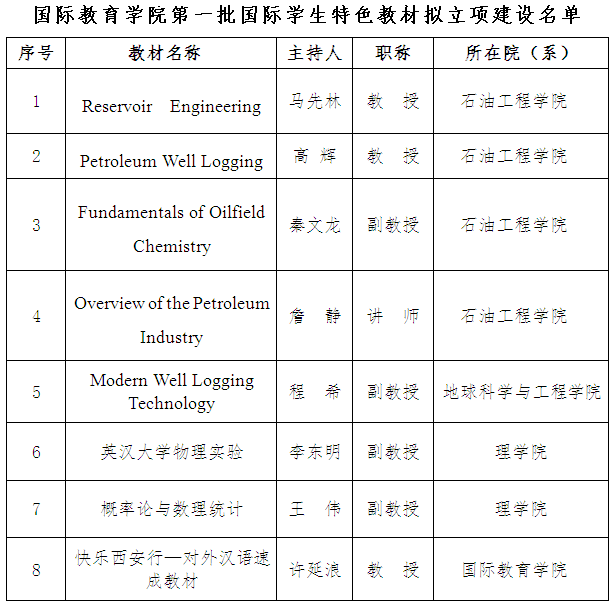 根據(jù)《西安石油大學(xué)關(guān)于開(kāi)展國(guó)際學(xué)生特色教材立項(xiàng)建設(shè)的通知》要求,我院?jiǎn)?dòng)了第一批校級(jí)國(guó)際學(xué)生特色教材立項(xiàng)建設(shè)工作。經(jīng)各院(系)教師申請(qǐng)、學(xué)院組織專(zhuān)家評(píng)審、學(xué)院院務(wù)會(huì)研究,決定將《Reservoir Engineering》等8部教材列為我院第一批國(guó)際學(xué)生特色教材擬立項(xiàng)建設(shè)項(xiàng)目。本批教材建設(shè)期限為2年,起止時(shí)間為2017年11月至2019年11月。屆時(shí)學(xué)院將組織驗(yàn)收,驗(yàn)收時(shí)教材主編須提供國(guó)家正式出版社出版教材1部?,F(xiàn)將擬立項(xiàng)建設(shè)教材名單公示如下:
