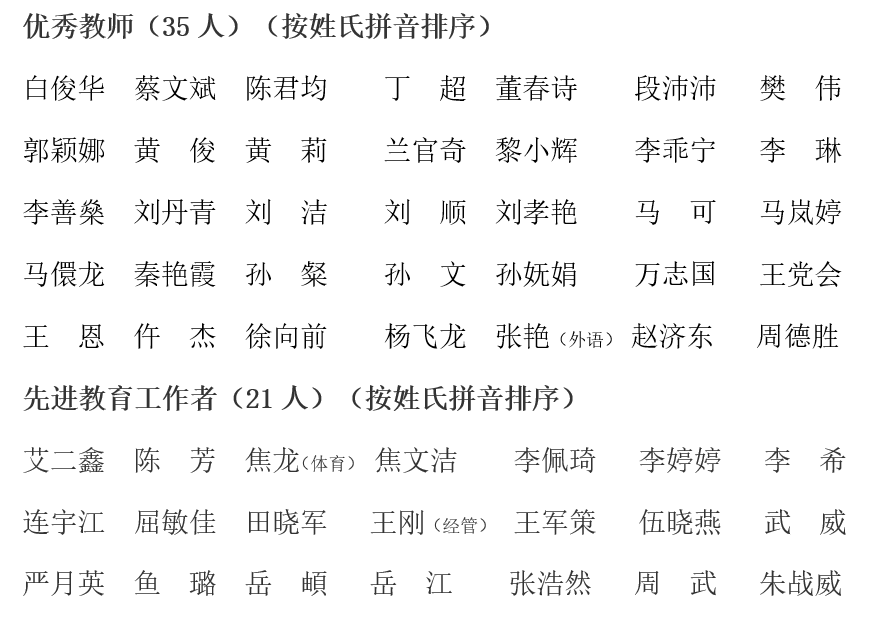 根據(jù)《西安石油大學(xué)優(yōu)秀教師 先進(jìn)教育工作者評(píng)選表彰辦法》(西石大黨[2021]47號(hào))和《關(guān)于2024年度優(yōu)秀教師、先進(jìn)教育工作者推薦評(píng)選的通知》,經(jīng)學(xué)校優(yōu)秀教師、先進(jìn)教育工作者評(píng)選表彰工作領(lǐng)導(dǎo)小組評(píng)選,現(xiàn)將2024年優(yōu)秀教師、先進(jìn)教育工作者公示如下:
