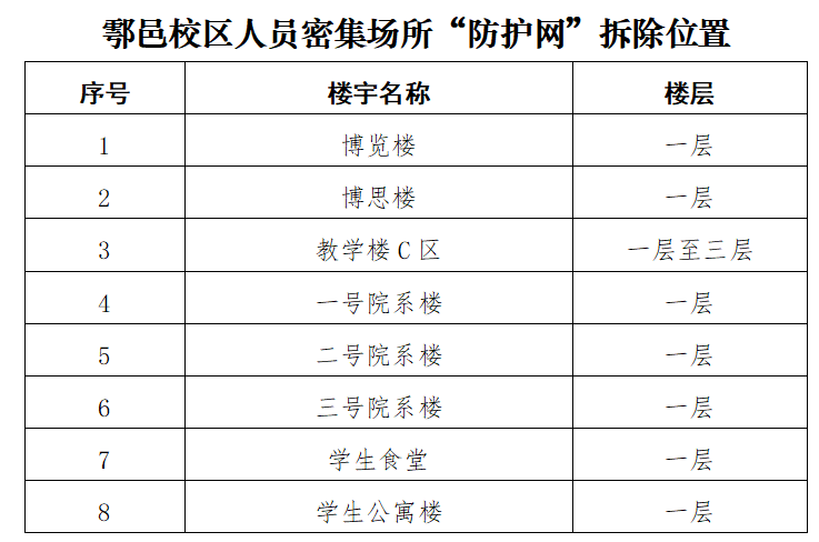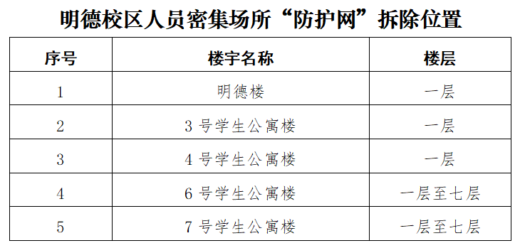 根據(jù)陜西省教育廳辦公室轉(zhuǎn)發(fā)《陜西省消防安全委員會(huì)辦公室關(guān)于進(jìn)一步加強(qiáng)人員密集場(chǎng)所“拆窗破網(wǎng)”專(zhuān)項(xiàng)工作的通知》(陜消安委辦發(fā)〔2024〕28號(hào))要求,經(jīng)學(xué)校研究決定,計(jì)劃于6月21日至6月30日期間對(duì)我校雁塔、明德、鄠邑三校區(qū)人員密集場(chǎng)所“防護(hù)網(wǎng)”進(jìn)行拆除作業(yè),請(qǐng)各單位予以配合,同時(shí)做好“防護(hù)網(wǎng)”拆除后的安全管理工作。本次“防護(hù)網(wǎng)”拆除區(qū)域及位置附后。