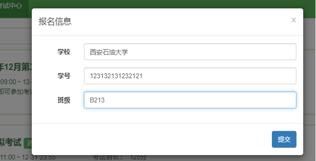 2、登錄成功后點擊“考試中心”,點擊對應(yīng)的場次“去報名”,填寫好自己的個人信息,點擊確定后即可報名成功,要保證個人信息無誤,避免影響成績。(班級填寫教學(xué)班,如B213)