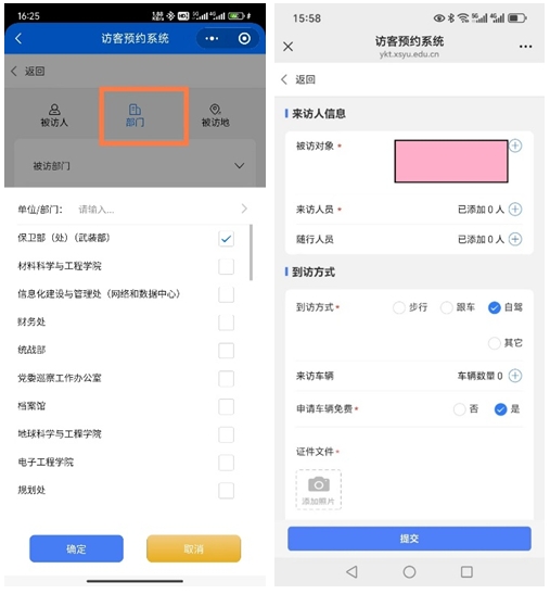 ⑤點擊被訪對象加號,選擇“部門”,點選被訪部門后確定,添加來訪人員姓名、數(shù)量、車牌號碼、出入時間等信息,選擇到訪方式以及是否申請免費等,上傳大型活動、交流會議學校批示件后提交。