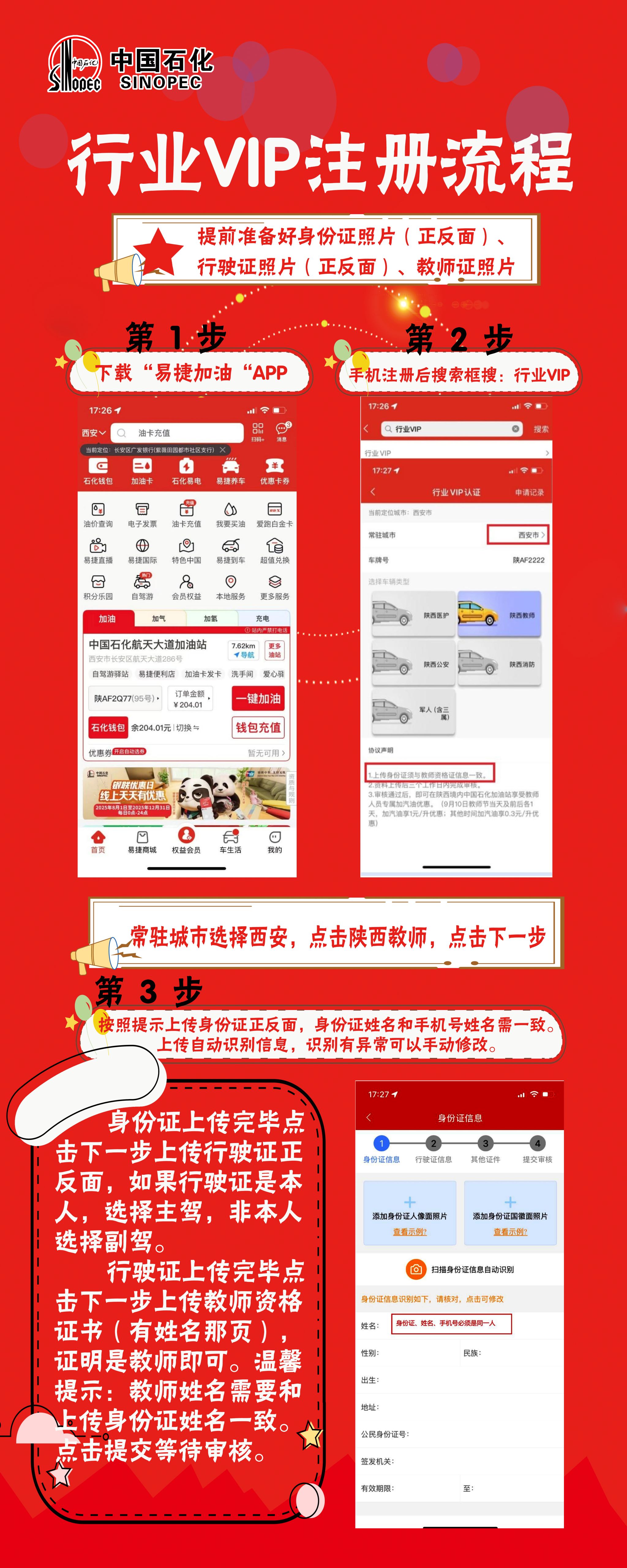 下載“易捷加油“APP→手機完成注冊后搜索框搜:行業(yè)VIP→上傳身份證(正反面)、行駛證(正反面)、教師證或工作證(帶名字及單位章頁),進行專項認證→提交審核→通過后自動加入對應(yīng)標簽并享受優(yōu)惠政策。具體操作詳見下圖: