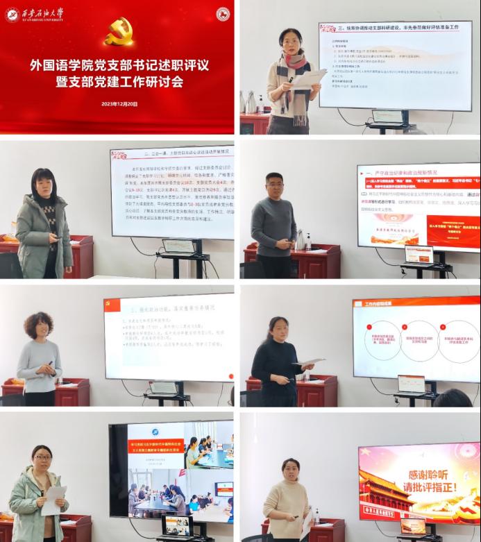 大學(xué)外語(yǔ)第一教學(xué)部、大學(xué)外語(yǔ)第二教學(xué)部、英語(yǔ)系、俄語(yǔ)系、翻譯系、多語(yǔ)種教學(xué)部教工黨支部及英語(yǔ)系學(xué)生黨支部7名支部書(shū)記作現(xiàn)場(chǎng)述職,3個(gè)學(xué)生黨支部進(jìn)行書(shū)面述職。述職會(huì)上,各黨支部書(shū)記圍繞落實(shí)黨的二十大精神和學(xué)習(xí)貫徹習(xí)近平新時(shí)代中國(guó)特色社會(huì)主義思想主題教育開(kāi)展情況,全面匯報(bào)了2023年黨支部標(biāo)準(zhǔn)化規(guī)范化建設(shè)、履行黨建工作責(zé)任、落實(shí)黨建工作任務(wù)、抓黨建促發(fā)展等情況,深刻剖析支部工作存在的不足,并提出下一步黨建工作的思路對(duì)策和設(shè)想。