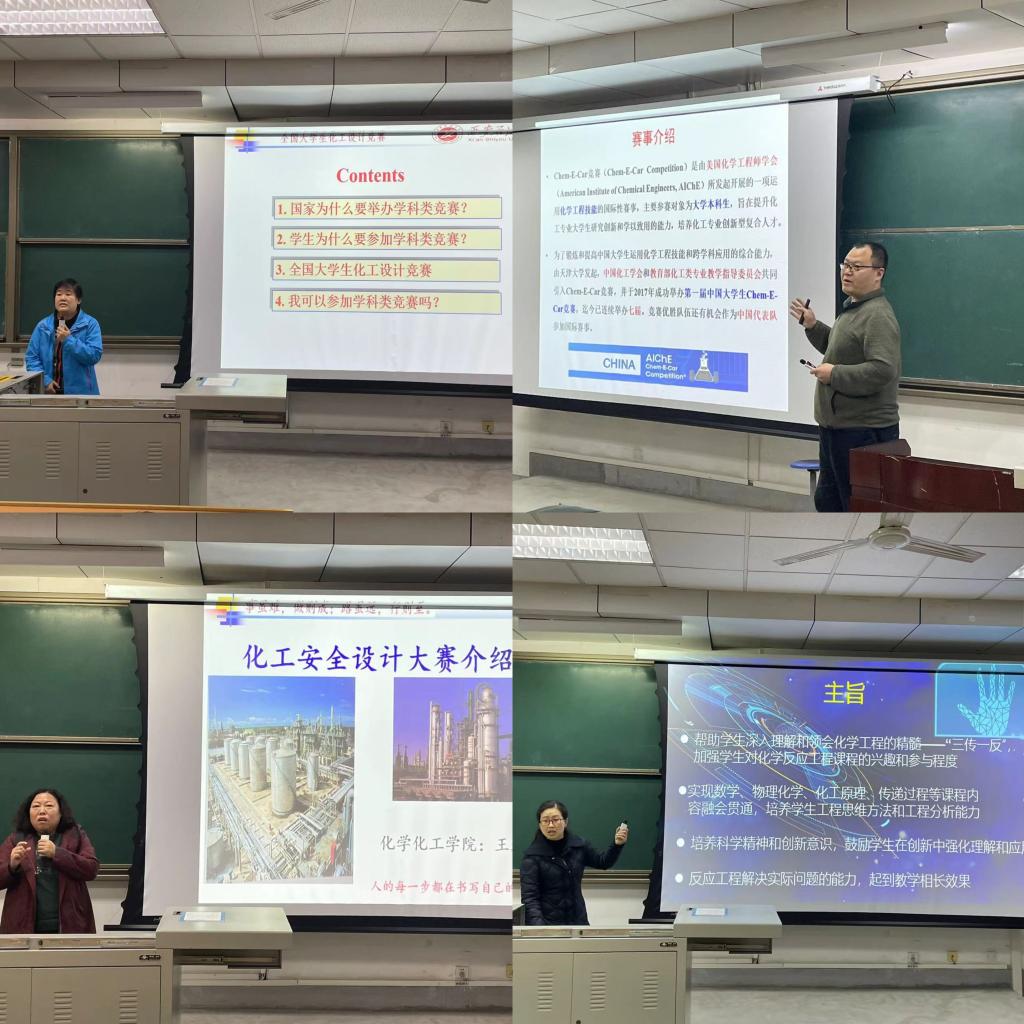 隨后,學(xué)科競賽指導(dǎo)老師劉菊榮、范崢、王進、唐璇依次就“全國大學(xué)生化工設(shè)計競賽”“全國大學(xué)生化工實驗大賽”“中國大學(xué)生Chem-E-Car競賽”“全國大學(xué)生化工過程數(shù)字創(chuàng)新競賽”“全國大學(xué)生化工安全設(shè)計大賽”“全國“互聯(lián)網(wǎng)+化學(xué)反應(yīng)過程”大學(xué)生課模設(shè)計大賽”等化工學(xué)科競賽有針對性的介紹分析了競賽概況、賽程與賽制、競賽內(nèi)容、競賽特點和我校以往獲獎情況,鼓勵同學(xué)們積極參與,勇于嘗試,提升自己的專業(yè)和創(chuàng)新能力,努力在競賽中取得新的突破。