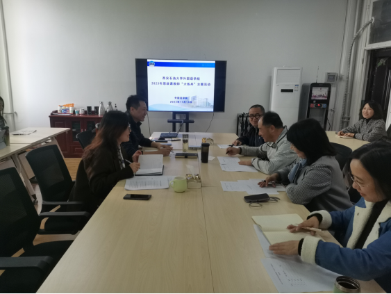 為認(rèn)真貫徹落實(shí)習(xí)近平總書(shū)記關(guān)于學(xué)校思想政治理論課的重要論述,按照《中共陜西省委辦公廳關(guān)于印發(fā)〈全國(guó)“大思政課”綜合改革試驗(yàn)區(qū)陜西省實(shí)施方案〉的通知》(陜辦字〔2023〕54號(hào))精神,加強(qiáng)高素質(zhì)、創(chuàng)新型教師隊(duì)伍建設(shè),深化課程育人質(zhì)量改革,外國(guó)語(yǔ)學(xué)院于11月14日下午在華油能源樓727舉辦了課程思政“大練兵”講課比賽,學(xué)院黨委書(shū)記田虹霞、副院長(zhǎng)陳武、大學(xué)外語(yǔ)教學(xué)一部主任李雪梅、大學(xué)外語(yǔ)教學(xué)二部主任彭健、英語(yǔ)系主任鐘澤波、翻譯系副主任秦艷霞參加了本次主題活動(dòng)。本次比賽由陳武副院長(zhǎng)主持。