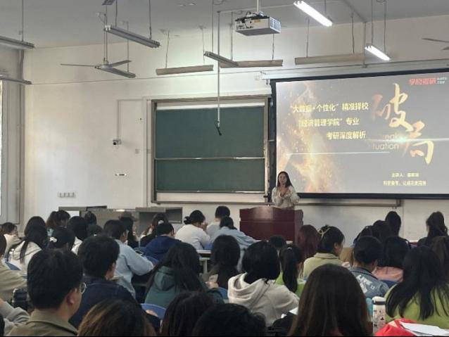 為了幫助學生更好開展職業(yè)生涯規(guī)劃,進一步促進大三學生對考研相關信息的掌握,經(jīng)濟管理學院于11月1日在鄠邑校區(qū)博思樓102教室舉辦了“研途砥礪,筑夢未來”考研專題講座。本次講座由學府考研毋咪咪老師擔任主講,內(nèi)容涵蓋專業(yè)深度分析、專業(yè)就業(yè)前景及專業(yè)競爭格局、特色院校以及復習規(guī)劃等方面,經(jīng)濟管理學院2021級150余名學生參加了本次講座。