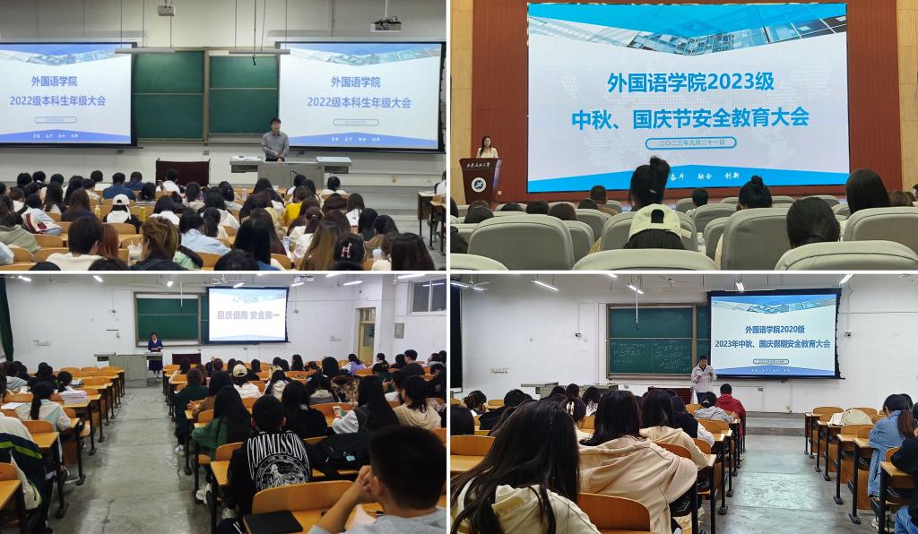 為切實(shí)做好學(xué)生教育管理服務(wù)工作,提高學(xué)生安全意識,筑牢安全防線,按照學(xué)校安排,外國語學(xué)院各年級輔導(dǎo)員分別在鄠邑校區(qū)弘石報(bào)告廳、B114、A234、B214召開2023年中秋國慶假期安全教育大會(huì)。