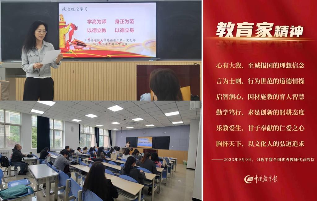在政治理論學(xué)習(xí)擴(kuò)大會上,付俊芳領(lǐng)學(xué)了習(xí)近平總書記教師節(jié)重要指示精神,她表示,作為新時代的高等教育工作者,我們要深刻理解習(xí)近平總書記在202399日致全國優(yōu)秀教師代表的信中提出的“心有大我、至誠報國的理想信念,言為士則、行為世范的道德情操,啟智潤心、因材施教的育人智慧,勤學(xué)篤行、求是創(chuàng)新的躬耕態(tài)度,樂教愛生、甘于奉獻(xiàn)的仁愛之心,胸懷天下、以文化人的弘道追求”教育家精神的科學(xué)內(nèi)涵和內(nèi)在邏輯牢記為黨育人、為國育才的初心使命,把師德師風(fēng)建設(shè)擺在首要位置,不僅在教學(xué)中為學(xué)生傳授知識,更通過自己的言行舉止為學(xué)生樹立正面榜樣,以赤誠之心、奉獻(xiàn)之心、仁愛之心投身大學(xué)英語教育事業(yè)。葛麗領(lǐng)學(xué)了學(xué)高為師 身正為范 以德立教 以德立身相關(guān)教育內(nèi)容,她談到習(xí)近平總書記強(qiáng)調(diào):師德是深厚的知識修養(yǎng)和文化品位的體現(xiàn)。師德需要教育培養(yǎng),更需要老師自我修養(yǎng)。做一個高尚的人、純粹的人、脫離了低級趣味的人,應(yīng)該是每一個老師的不懈追求和行為常態(tài)。