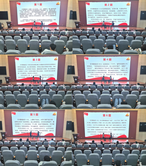 630日,于鄠邑校區(qū)弘石報告廳開展案例研討和談心談話環(huán)節(jié)。學(xué)生工作部部長王亮、學(xué)生心理成長指導(dǎo)中心主任肖瓊、校團(tuán)委書記何國強,部分院系學(xué)生工作負(fù)責(zé)人擔(dān)任大賽評委,選基礎(chǔ)知識測試得分前12名選手進(jìn)入案例研討環(huán)節(jié),選基礎(chǔ)知識測試得分×20%+案例研討得分×40%,綜合得分前6名選手進(jìn)入談心談話環(huán)節(jié),全體學(xué)工干部現(xiàn)場觀摩比賽。
