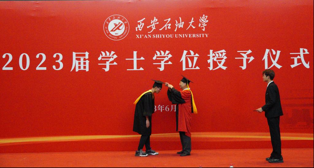 6月19日下午,我院2023屆學(xué)士學(xué)位授予儀式在鄠邑校區(qū)圖書(shū)館弘石報(bào)告廳隆重舉行,217名學(xué)士學(xué)位獲得者依序上臺(tái)撥穗正冠,為四年青春畫上了完美的句號(hào)。
