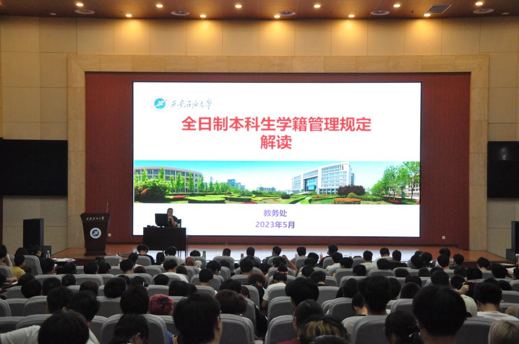 為進(jìn)一步使在校生詳細(xì)了解學(xué)校關(guān)于學(xué)籍管理的相關(guān)規(guī)定,保障學(xué)生的合法權(quán)益,從校規(guī)校紀(jì)嚴(yán)格要求學(xué)生,加強(qiáng)學(xué)生間的學(xué)風(fēng)建設(shè),石油工程學(xué)院于5月24日下午、晚上在西安石油大學(xué)鄠邑校區(qū)學(xué)術(shù)報告廳進(jìn)行兩場全日制本科生學(xué)籍管理規(guī)定解讀講座,主講人為教務(wù)處副處長馬加傳、教務(wù)處教務(wù)科科長張浩,2021級輔導(dǎo)員秦馨雨、2022級輔導(dǎo)員聶康晨主持本次講座,2021級、2022級全體學(xué)生參加本次講座。