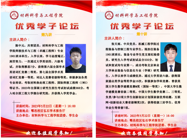 5月22日下午,材料科學與工程學院在鄠邑校區(qū)弘石報告廳舉辦優(yōu)秀學子論壇第九講和第十講,本期邀請到的優(yōu)秀學子是機械工程學院張?zhí)煊?,目前被北京林業(yè)大學錄取攻讀研究生;材料科學與工程學院陳中元,目前被哈爾濱工程大學煙臺研究院錄取攻讀研究生。我院300余名本科生參加論壇。