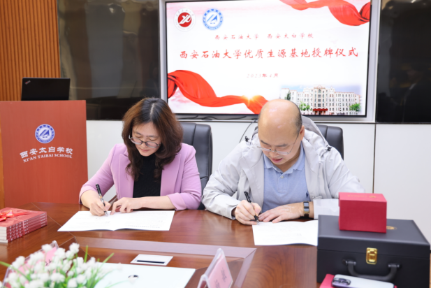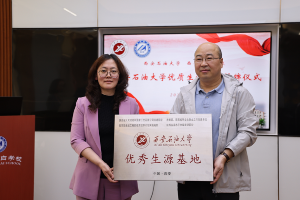 會上,田虹霞代表學(xué)校與西安太白學(xué)校簽署了《西安石油大學(xué)優(yōu)秀生源基地建設(shè)協(xié)議》,并授予“優(yōu)秀生源基地”牌匾。