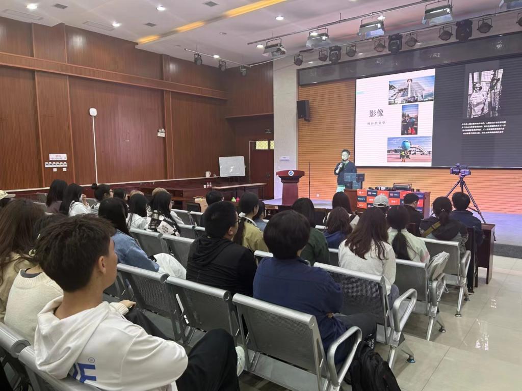 在講座上,王健向同學(xué)們講解了如Alpha 7S III、FX3、FX6、A7M4等多種器械的特點(diǎn)及其使用方法和適用場景,之后又向?qū)W生們解釋了曝光三元素:快門、光圈、感光度及景深的區(qū)分和需求應(yīng)用。此外,王健分別從“如何讓視頻具有電影感”“從拍攝思維轉(zhuǎn)變?yōu)閯?chuàng)作思維”“確定題材到開拍需要準(zhǔn)備什么”“你的影片少了什么”和“影片結(jié)構(gòu)邏輯:腳本-導(dǎo)演-攝影-臨場構(gòu)圖-美術(shù)思維-音樂理解-現(xiàn)場調(diào)度”等五個方面向?qū)W生們展示了視頻制作的要素及過程。在理論知識講解完成后,王健向?qū)W生們展示了芮城宣傳片、和王健本人拍攝的短視頻,讓學(xué)生們在視頻中體會拍攝和剪輯的技巧。隨后,部分同學(xué)又跟隨王健來到第二會場,現(xiàn)場學(xué)習(xí)了部分短視頻的拍攝技巧。