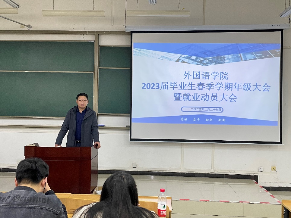 院黨委副書記王業(yè)青梳理了各年級本學(xué)期的重點工作和主要任務(wù),介紹了學(xué)院專四專八考試、考研和就業(yè)等情況,并結(jié)合各年級實際情況強(qiáng)調(diào),2019級學(xué)生要結(jié)合自身實際,合理安排好學(xué)業(yè)、實習(xí)就業(yè)、考研復(fù)試等各類考試事宜,樹立正確的就業(yè)觀、擇業(yè)觀,認(rèn)清就業(yè)形勢,搶抓就業(yè)機(jī)會,認(rèn)真做好畢業(yè)前的各項準(zhǔn)備工作;2020級學(xué)生要積極參加各類科研競賽,認(rèn)真準(zhǔn)備專四考試,提前做好考研、就業(yè)準(zhǔn)備;2021級學(xué)生要做好學(xué)業(yè)規(guī)劃,設(shè)立階段目標(biāo),嚴(yán)格遵守學(xué)校和學(xué)院的各項管理規(guī)定,增強(qiáng)安全防范意識和自我防護(hù)能力,保持良好的個人衛(wèi)生和生活習(xí)慣;2022級學(xué)生要高度重視第一課堂學(xué)習(xí)、第二課堂綜合素質(zhì)培養(yǎng),強(qiáng)化班級和宿舍建設(shè),主動適應(yīng)變化,提升獨立自主和溝通交往能力,提高個人禮儀修養(yǎng),加強(qiáng)體育鍛煉,珍惜時間,充實大學(xué)學(xué)習(xí)生活。