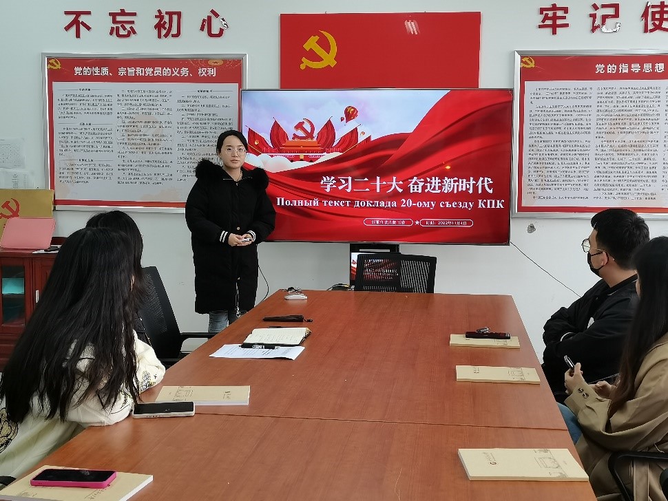 支部黨員沈九薇表示:Какмолодойчеловекновойэпохи,мыдолжнытвердослушатьпартийныеслова,идтиспартией,чтобыбытьсмелымихорошимимолодымилюдьминовойэпохи,чтобысделатьидеал,чтобывзятьнасебясмелость,чтобысъестьтрудности,чтобымолодыелюдивполноймересозидатьсовременноесоциалистическоегосударствонапрактике.(作為新時(shí)代青年,我們要堅(jiān)定不移聽黨話、跟黨走,立志做有理想、敢擔(dān)當(dāng)、能吃苦、肯奮斗的新時(shí)代好青年,讓青春在全面建設(shè)社會主義現(xiàn)代化國家的火熱實(shí)踐中綻放絢麗之花。)