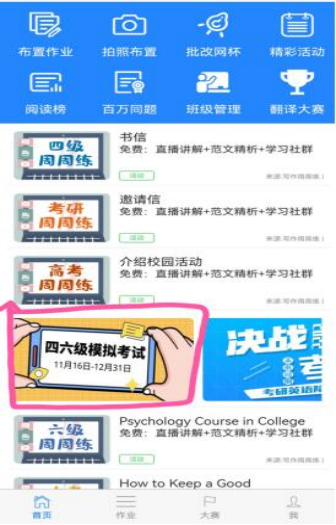 為達(dá)到良好的模擬測(cè)試效果,此次??际褂门木W(wǎng)平臺(tái)進(jìn)行發(fā)布,于11月19日至11月25日對(duì)我校學(xué)生進(jìn)行線上模擬測(cè)試。外國(guó)語(yǔ)學(xué)院規(guī)劃考試安排,細(xì)化考試流程,并且??碱}型全面,來(lái)源權(quán)威,具有重要的模擬價(jià)值。在大學(xué)英語(yǔ)四級(jí)考試前對(duì)學(xué)生進(jìn)行此次模擬演練,目的讓學(xué)生熟悉題型、鍛煉心態(tài),了解四級(jí)的命題特點(diǎn),難度和題型,提高同學(xué)們對(duì)大學(xué)英語(yǔ)四級(jí)考試的重視度和應(yīng)試能力,引導(dǎo)同學(xué)們積極備戰(zhàn),實(shí)現(xiàn)個(gè)人英語(yǔ)水平的有效提升、疑難問(wèn)題的專項(xiàng)突破,幫助同學(xué)們?cè)缛枕樌ㄟ^(guò)大學(xué)英語(yǔ)四級(jí)考試。