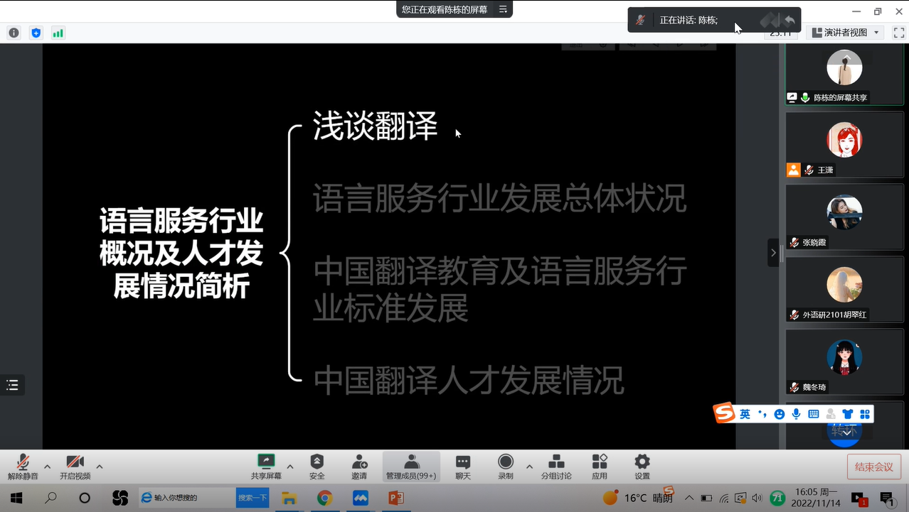 為進(jìn)一步做好2023屆畢業(yè)生就業(yè)創(chuàng)業(yè)工作,加強(qiáng)學(xué)生就業(yè)指導(dǎo),強(qiáng)化就業(yè)育人實(shí)效,提高翻譯碩士研究生的職業(yè)素養(yǎng),幫助學(xué)生了解語言服務(wù)行業(yè)的基本現(xiàn)狀,引導(dǎo)學(xué)生從實(shí)際出發(fā)選擇職業(yè)和崗位,做好職業(yè)規(guī)劃。11月14日下午,外國語學(xué)院邀請(qǐng)中譯語通(陜西)科技有限公司語言服務(wù)事業(yè)群陳棟副總監(jiān),為我校MTI全體研究生作題為“語言服務(wù)行業(yè)及其發(fā)展概況”的線上專題講座。外國語學(xué)院MTI全體研究生100余人參加講座,講座由副院長劉輝主持。