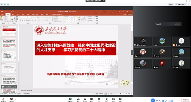 11月3日和11日下午,能源與動力工程系教工黨支部先后組織支部全體教師開展了2次學(xué)習(xí)黨的二十大精神微黨課學(xué)習(xí)活動,活動以線上線下相結(jié)合的方式進行。結(jié)合當(dāng)前黨的二十大精神學(xué)習(xí)的高潮和支部建設(shè)“三會一課”的要求,黨支部書記蘇亞麗講述了題為《深入實施科教興國戰(zhàn)略,強化中國式現(xiàn)代化建設(shè)的人才支撐——學(xué)習(xí)貫徹黨的二十大精神》的微黨課,對黨的二十大報告中關(guān)于科技、教育、人才的內(nèi)容進行了梳理。微黨課之后,參會教師表達了對黨的二十大精神學(xué)習(xí)的體會和感悟,大家紛紛表示報告中關(guān)于新能源和能源安全的論述給新能源學(xué)院提供了新的機遇,也提出了新的任務(wù),我們要結(jié)合我們的本職工作和我們的專業(yè)特色,在新的機遇和挑戰(zhàn)之下更上一層樓。能源與動力工程系主任唐凌虹結(jié)合自己的訪學(xué)經(jīng)歷談到了目前國際形勢的復(fù)雜多樣性,教師黨員首先要帶頭完成好本職工作,結(jié)合能動專業(yè)要申請工程教育認證的契機,細化教學(xué)過程的每一個環(huán)節(jié),為高質(zhì)量人才培養(yǎng)貢獻力量。