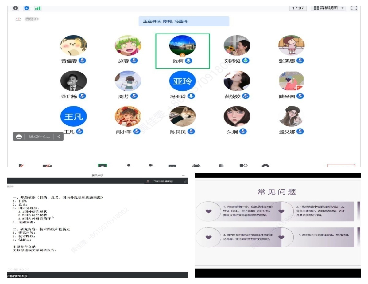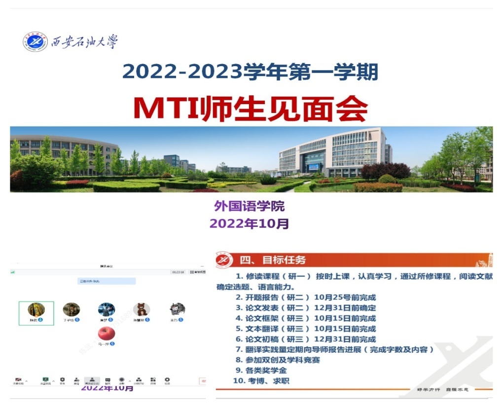 各位研究生導(dǎo)師圍繞2022級(jí)研究生課程學(xué)習(xí)、2021級(jí)研究生學(xué)位論文開(kāi)題和翻譯實(shí)習(xí)實(shí)踐、2020級(jí)研究生學(xué)術(shù)論文發(fā)表與學(xué)位論文撰寫、研究生創(chuàng)新實(shí)踐項(xiàng)目的申報(bào)、以及翻譯實(shí)踐任務(wù)的完成情況等,聽(tīng)取了學(xué)生的匯報(bào),進(jìn)行了細(xì)致的指導(dǎo),并提出下一步的工作要求。導(dǎo)師們鼓勵(lì)學(xué)生在封閉期間更要合理安排時(shí)間,規(guī)劃好學(xué)習(xí)和生活,要充分利用圖書館等良好的學(xué)習(xí)環(huán)境以及學(xué)校豐富的線上線下學(xué)習(xí)資源,既要確保健康安全,又要高效推進(jìn)學(xué)業(yè)發(fā)展。