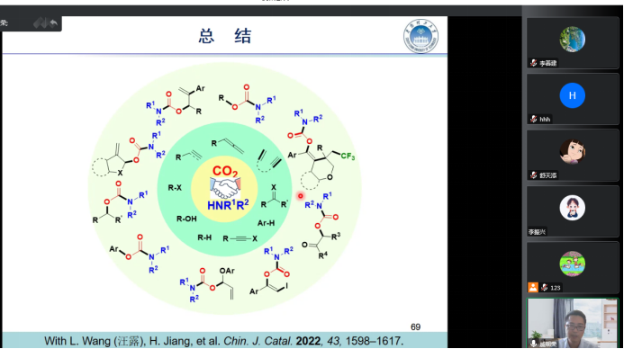戚朝榮校友2004年畢業(yè)于我?;瘜W(xué)化工學(xué)院并取得碩士學(xué)位,主要研究方向為二氧化碳化學(xué)轉(zhuǎn)化與利用,近年來在該領(lǐng)域取得了豐碩的研究成果。氨基甲酸酯是一類重要的化合物,是很多具有生物活性的天然產(chǎn)物的基本結(jié)構(gòu)單元,在醫(yī)藥、農(nóng)藥和有機合成等領(lǐng)域得到廣泛應(yīng)用。傳統(tǒng)合成氨基甲酸酯的方法使用光氣等有毒原料容易引起健康風(fēng)險及環(huán)境污染。本次報告,戚朝榮教授介紹了其團(tuán)隊利用二氧化碳替代光氣,在過渡金屬催化或無金屬催化條件下實現(xiàn)了二氧化碳與胺和其它化合物,包括腙、二芳基碘鎓鹽、酮、芳基硼酸、聯(lián)烯基醚、芳炔或重氮酸酯等多組分反應(yīng),構(gòu)建出系列氨基甲酸酯類化合物,為合成有用的氨基甲酸酯化合物提供了簡便高效的途徑。