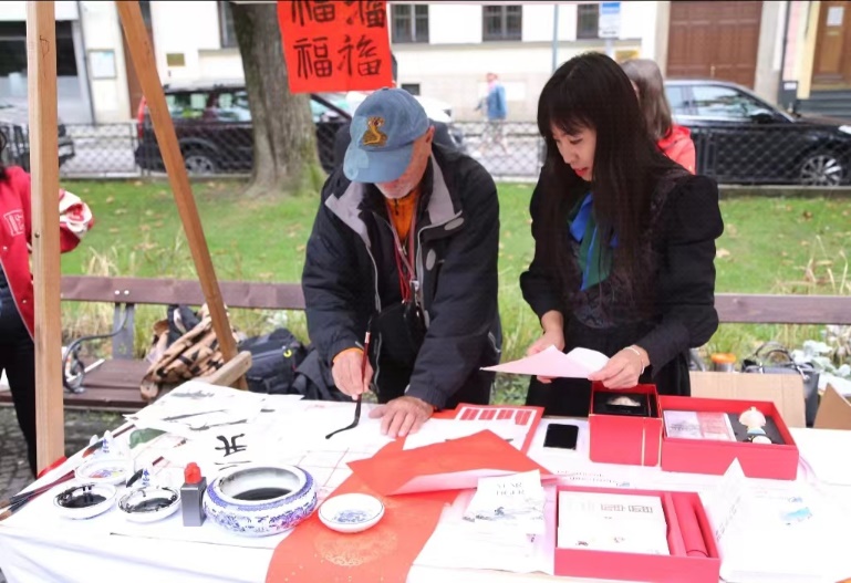 當(dāng)?shù)貢r(shí)間10月1日,中國(guó)駐斯洛伐克大使館在斯洛伐克首都布拉迪斯拉發(fā)的赫維茲多斯拉夫廣場(chǎng)(Hviezdoslavovo námestie)與印尼、日本、越南大使館共同舉辦亞洲文化節(jié)。2019級(jí)劉丹同學(xué)被當(dāng)?shù)乜自号赏舜位顒?dòng),協(xié)助中國(guó)書法文化體驗(yàn)展臺(tái)。劉丹說,印象最深的是遇到一位老人(下圖),他學(xué)過很久漢語(yǔ),喜歡中國(guó)文化,去過中國(guó)很多地方,練習(xí)太極拳也很久了。說到體驗(yàn)書法,老人最先寫出的是“開”字。后來(lái)他又拿出手機(jī),驕傲的展示:“華為”,熟練地在手機(jī)里找到很多漢字圖片,并再一次用書法寫下“永遠(yuǎn)”。劉丹說:我很榮幸在國(guó)慶這一天,遠(yuǎn)在海外可以參加這次有意義的文化傳播活動(dòng),并作為參與者,讓很多人更了解中國(guó)的書法文化,對(duì)我也是彌足珍貴的經(jīng)歷;在中華人民共和國(guó)成立73周年國(guó)慶期間,祝祖國(guó)山河無(wú)恙,國(guó)泰民安!