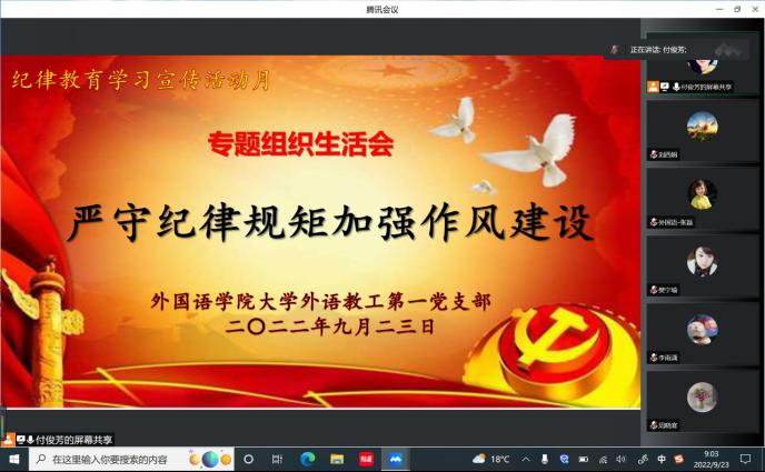 根據(jù)學(xué)院黨委關(guān)于開(kāi)展第五個(gè)紀(jì)律教育學(xué)習(xí)宣傳月活動(dòng)要求,9月23日上午,外國(guó)語(yǔ)學(xué)院大學(xué)外語(yǔ)第一教學(xué)部黨支部通過(guò)騰訊會(huì)議上召開(kāi)線上“嚴(yán)守紀(jì)律規(guī)矩、加強(qiáng)作風(fēng)建設(shè)”專(zhuān)題組織生活會(huì)。黨支部全體黨員參加會(huì)議。會(huì)議由黨支部書(shū)記付俊芳主持。