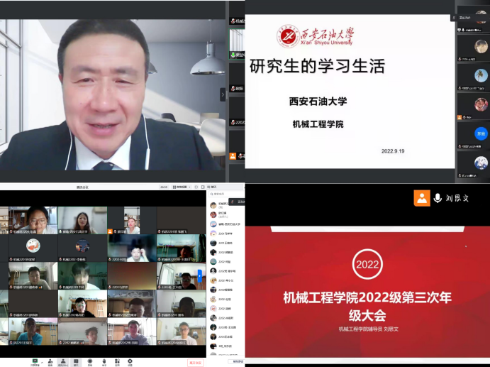 9月17日-19日,機(jī)械工程學(xué)院召開2022級全體本研新生入學(xué)教育線上會議。機(jī)械工程學(xué)院院長竇益華、副院長崔璐、黨委副書記劉冰先后應(yīng)邀出席會議,會議分別由輔導(dǎo)員歐紅娟、劉思文主持。竇益華院長向同學(xué)們介紹相關(guān)學(xué)科專業(yè)的特色和優(yōu)勢,開展專業(yè)教育,圍繞我?!笆途褶k學(xué),鐵人精神育人,延安精神鑄魂”的特色,將石油精神鐵人精神教育和專業(yè)教育相結(jié)合,引導(dǎo)新生領(lǐng)悟石油精神鐵人精神內(nèi)涵,奮發(fā)圖強(qiáng),刻苦學(xué)習(xí)專業(yè)知識,掌握扎實本領(lǐng)。崔璐副院長根據(jù)學(xué)校研究生相關(guān)管理制度,結(jié)合院系實際,開展新生校規(guī)校紀(jì)教育,并組織新生觀看疫情防控知識。劉冰副書記參加本科生會議指出,疫情期間實行靜態(tài)化管理,各位新生要嚴(yán)格落實疫情管理規(guī)定,定期進(jìn)行核酸檢測,養(yǎng)成公共區(qū)域戴口罩的良好習(xí)慣。歐紅娟、劉思文老師從遵守校規(guī)校級及安全方面做出教育,并希望同學(xué)們注意宿舍安全及網(wǎng)絡(luò)安全等設(shè)立好學(xué)習(xí)目標(biāo),保持良好精神面貌,融入集體,要結(jié)合自身實際,確立好未來發(fā)展方向。