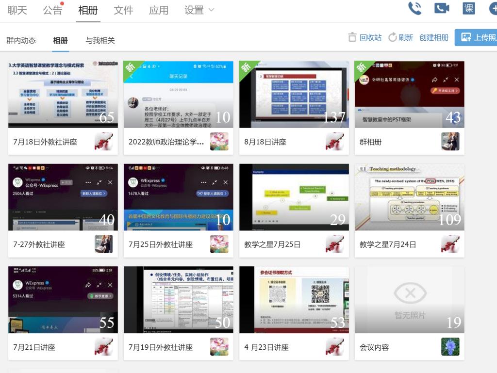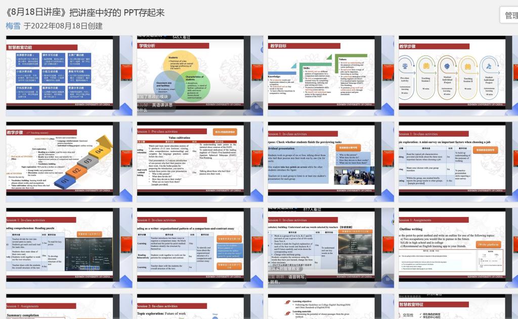 大學外語教學一部根據(jù)教學部所承擔的教學任務特點,教師個人發(fā)展需求,以及院校特色選取了研修班和論壇日程安排中部分講座作為必修內(nèi)容,如“高質(zhì)量發(fā)展背景下一流課程建設理念與實施路徑”、“智慧賦能:打造WE外語教育的共同未來”、“文明互鑒:高校外語教師中外人文素養(yǎng)提升”、“外語課程思政的縱深推進:人才培養(yǎng)的目標、理念與路徑”、“學科智慧教室環(huán)境下的新型課堂教學模式創(chuàng)新與實踐云專題”等,要求全體教師認真學習,互相交流學習心得,并在教學部工作群中建立了相應的講座資料群相冊,留存講座重要內(nèi)容,以供后期查閱學習。同時,大外教學一部也鼓勵教師們根據(jù)自己的教研興趣選修研修班和論壇日程中其它講座內(nèi)容。