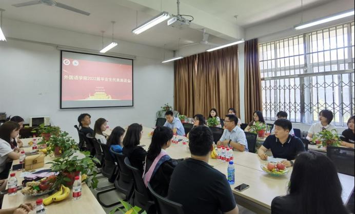 6月24日下午,外國語學院在鄠邑校區(qū)崇文樓314會議室召開2022屆畢業(yè)生代表座談會。學院黨委書記田虹霞、副書記王業(yè)青、副院長陳武、學生工作辦公室主任周宇、2018級輔導員陳浩以及2022屆畢業(yè)生代表共計30余人參加座談會。會議由院黨委副書記王業(yè)青主持。