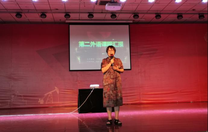 本次課程匯報演出共分為三個部分。第一部分由多語種教學部副主任陳旭老師介紹我校目前第二外語課程開設情況、教學亮點、近年來取得的教學成果、以及未來教學的目標和計劃。